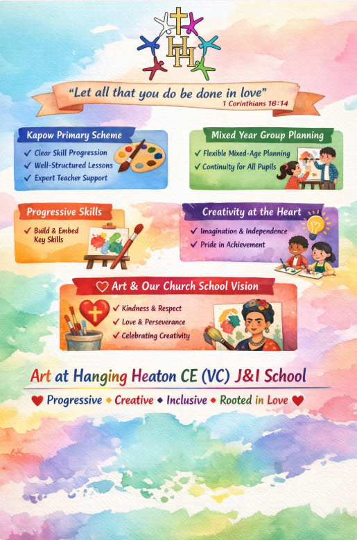 At Hanging Heaton CE (VC) J&I School, we use the Kapow Primary Art and Design & Technology schemes to ensure high-quality teaching, clear progression and consistent curriculum coverage across the school.