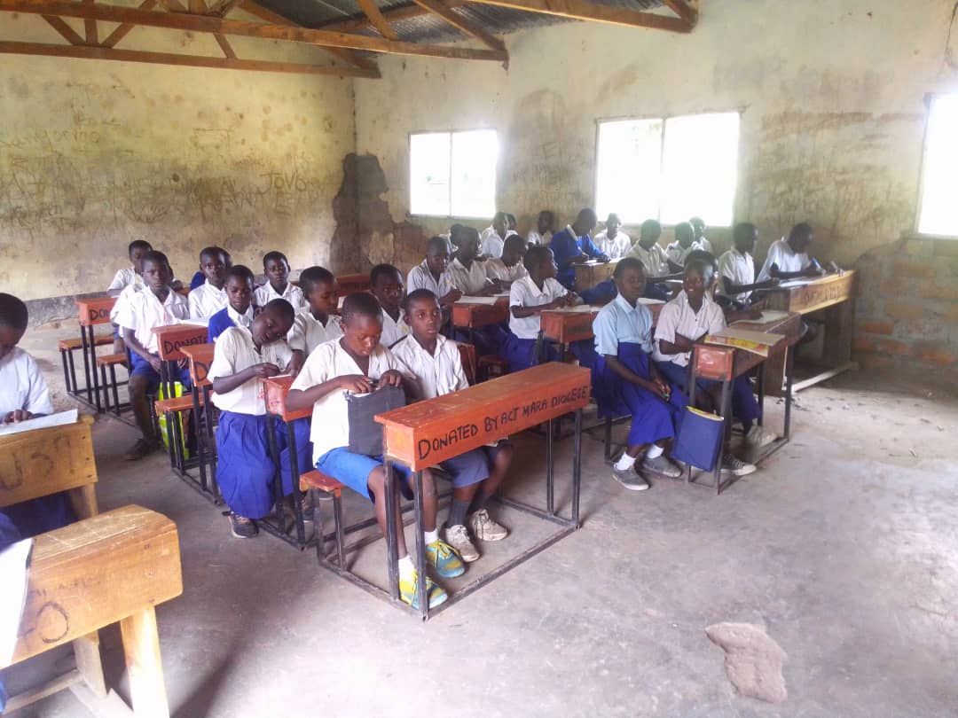 Unfortunately, several classrooms were in a poor state of repair and could not be used. As a result, children from different year groups were required to share learning spaces in order to continue their education. Due to a shortage of furniture, many pupils were working on the floor rather than at desks.